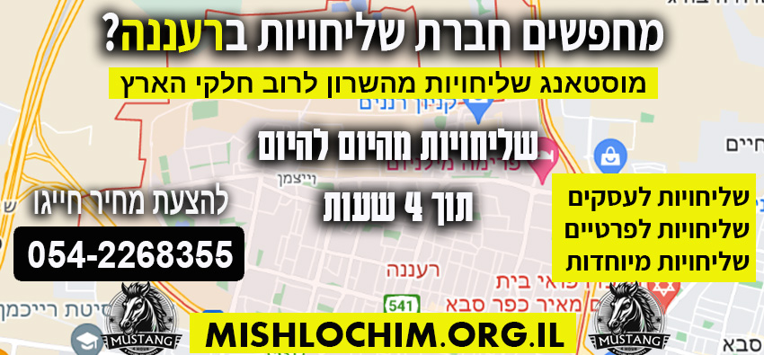 מוסטאנג – חברת שליחויות ברעננה תסייע לכם לשנע כמעט כל שתרצו כמעט לכל מקום בארץ ובמחירים סבירים. ביצוע שליחות ברעננה מחיר הוגן נקבעת בהתאם לדחיפות, היעד וכמות המשלוחים.